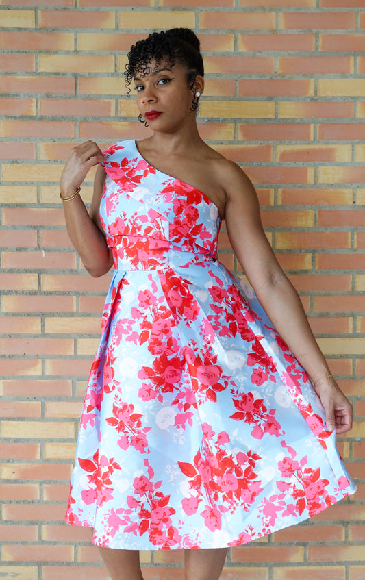 Les fleurs aux teintes de rouge et bleu sur fond pastel créent une allure douce et romantique, tandis que la coupe asymétrique à une épaule ajoute une touche moderne et chic.En vente